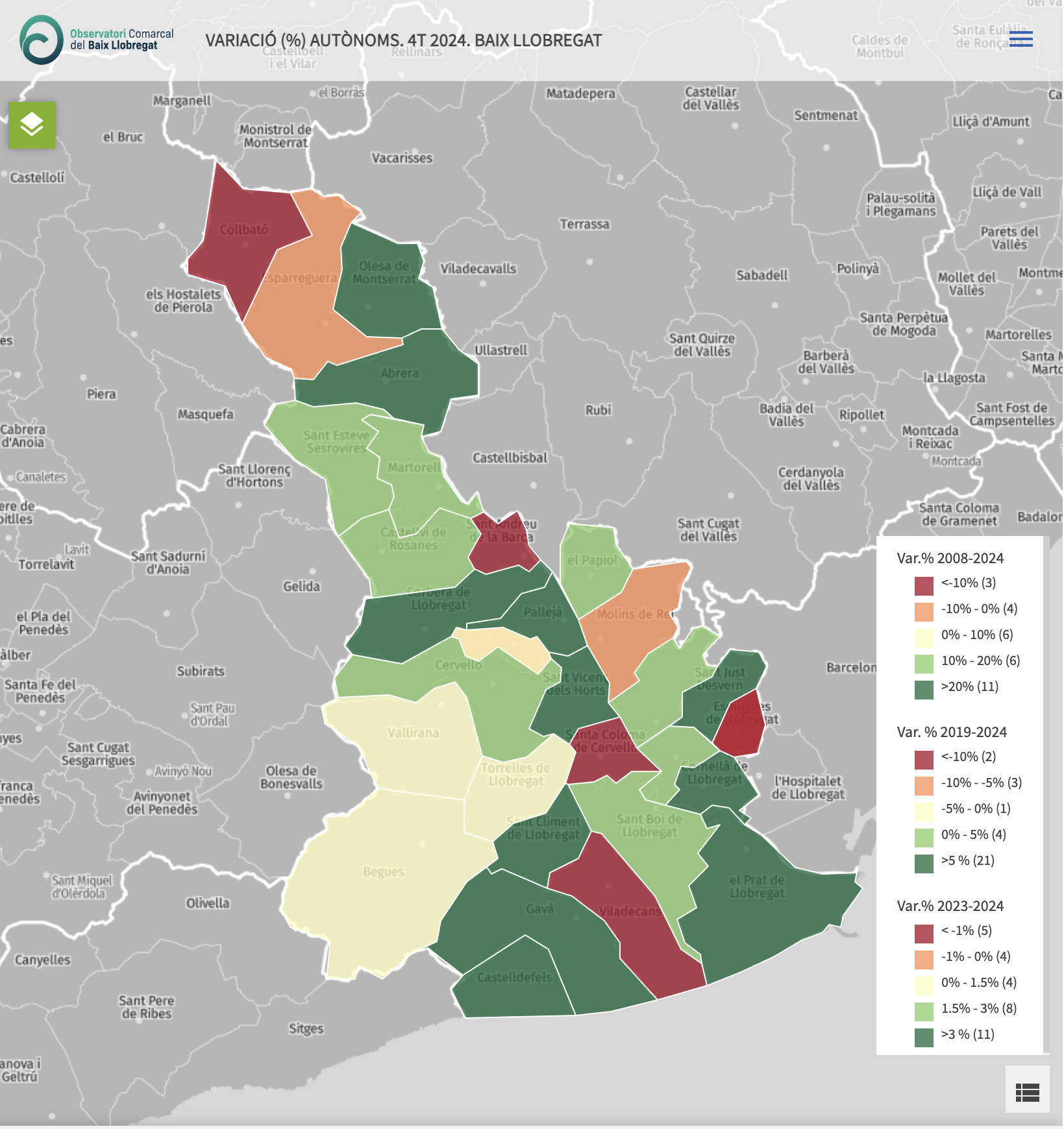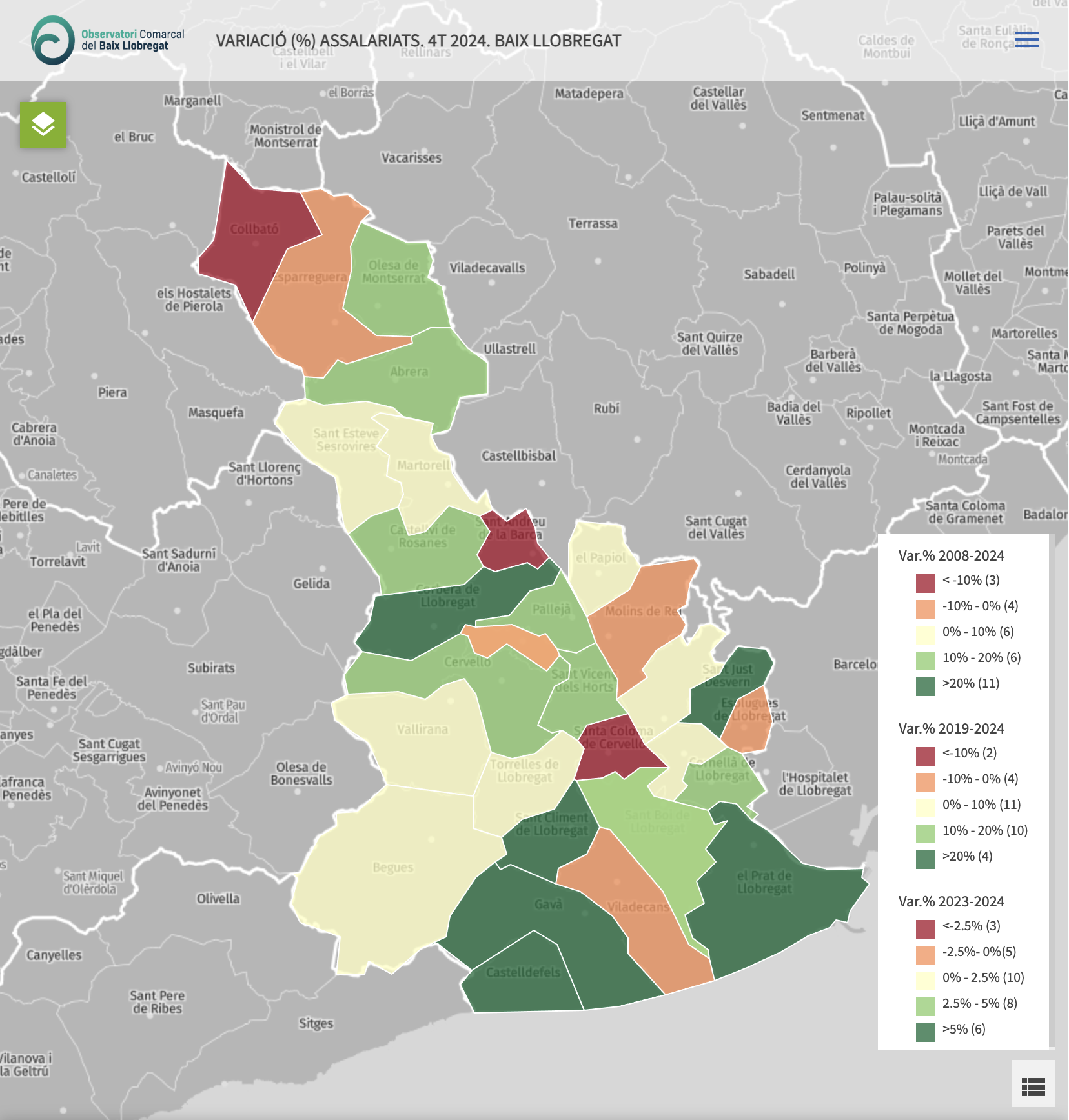 A més, set localitats han perdut llocs de treball assalariats respecte 2023: Sant Andreu de la Barca (-17,8%), Santa Coloma de Cervelló (-5,1%), Collbató (-3,8%), Viladecans (-1,9%), Esplugues de Llobregat (-1,0,%) i Molins de Rei (-0,1%). Per altra banda, Corbera de Llobregat (+6,6%), Sant Just Desvern (5,5%) i Castelldefels (5,5%) són els municipis amb més creixement de l’afiliació. En total, hi ha un 2,1% més de llocs de treball assalariats a la comarca que al mateix trimestre del 2023.
