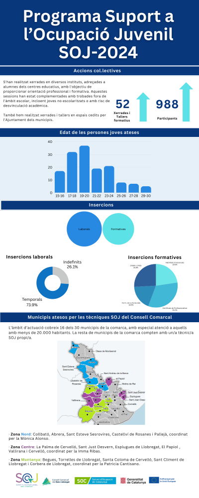 Un total de 146 joves d’entre 16 i 29 anys han rebut atenció personalitzada i un seguiment continuat en processos d’orientació individualitzats a llarg termini. El SOJ s’ha consolidat com una eina essencial per fomentar la inclusió laboral i educativa en una comarca amb més de 134.000 joves, contribuint significativament al seu desenvolupament i futur.