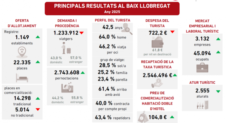 El sector turístic del Baix Llobregat ha tancat l'exercici 2025 amb un balanç agredolç pel que fa al volum de visitants, però amb xifres rècord en termes de recaptació fiscal i despesa. Segons l'Informe Anual de l'Activitat Turística publicat pel LABturisme de la Diputació de Barcelona, la comarca va ingressar un total de 2.546.496 euros mitjançant l'impost sobre les estades en establiments turístics, fet que suposa un increment del 20% respecte a l'any anterior.