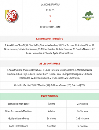 Per segona vegada, Les Corts UBAE va guanyar el títol de la Copa Catalunya femenina a l’imposar-se a la final per 0-4 al Lainco Esportiu Rubí. Des dels primers minuts de la final, les barcelonines van agafar el domini del partit, i va marcar en el minut 3 i en el 10, amb gols de Martita. El Rubí va tenir les seves ocasions en el contraatac, però l’hi va faltar definició. Amb aquest resultat es va arribar al descans.