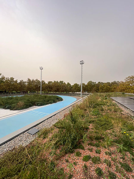 - Porxo amb una coberta vegetal on hi ha plaques fotovoltaiques, que produiran l’energia que necessita l’edifici. La coberta, inclinada amb uns 5º de pendent, té dos tipus de vegetació – zoisia i gramínies- per tal d’assimilar-se al màxim amb l’entorn.