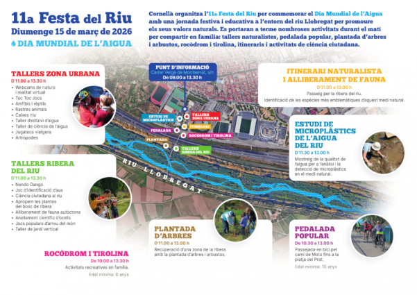 El proper diumenge 15 de març, Cornellà de Llobregat commemorarà el Dia Mundial de l'Aigua amb l'onzena edició de la Festa del Riu. Aquesta cita anual té com a objectiu principal posar en valor l'entorn natural del riu Llobregat, un espai que ha passat de ser una zona degradada a convertir-se en un patrimoni ciutadà de referència per al lleure i la biodiversitat des de les actuacions de recuperació iniciades a principis de segle.