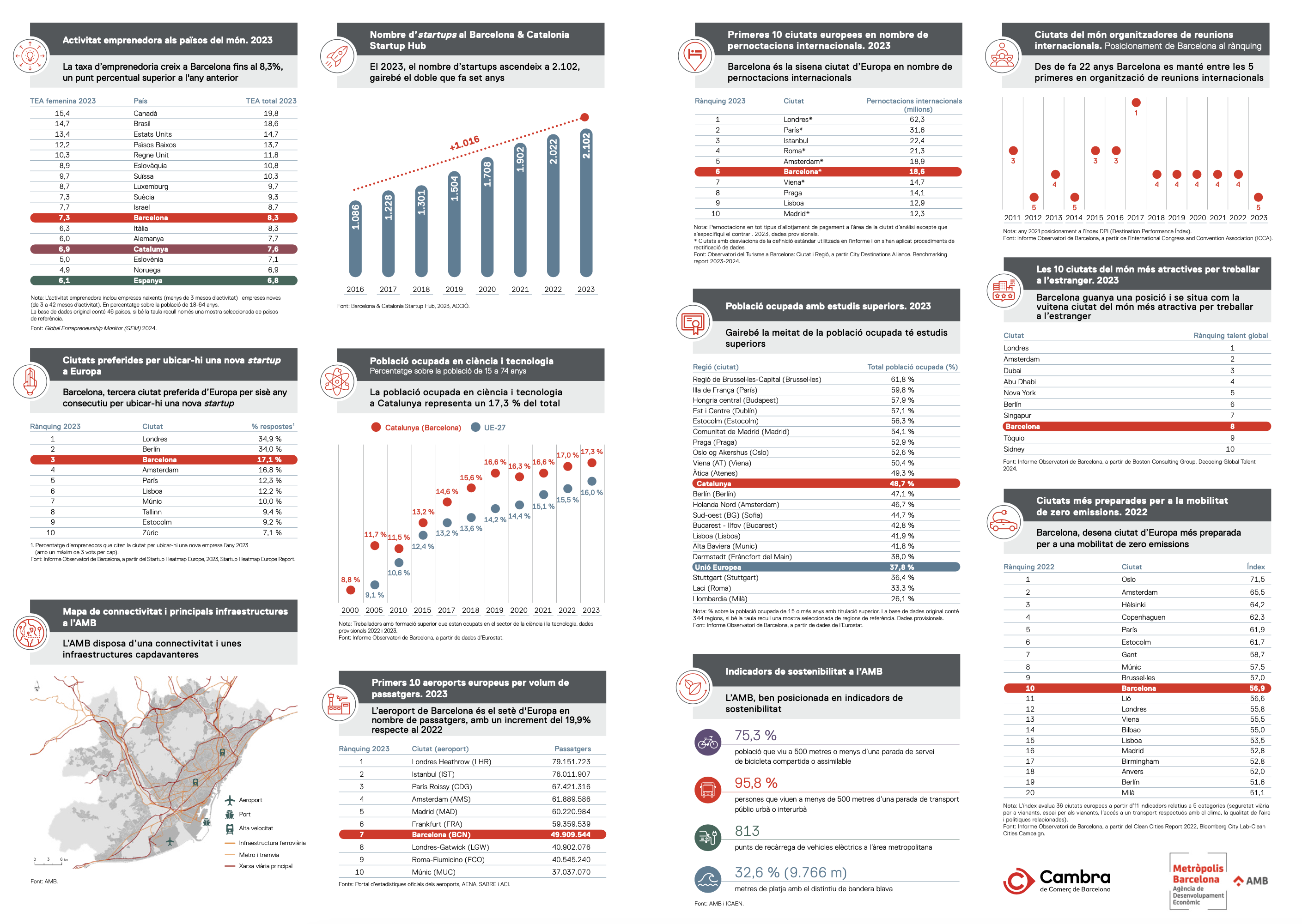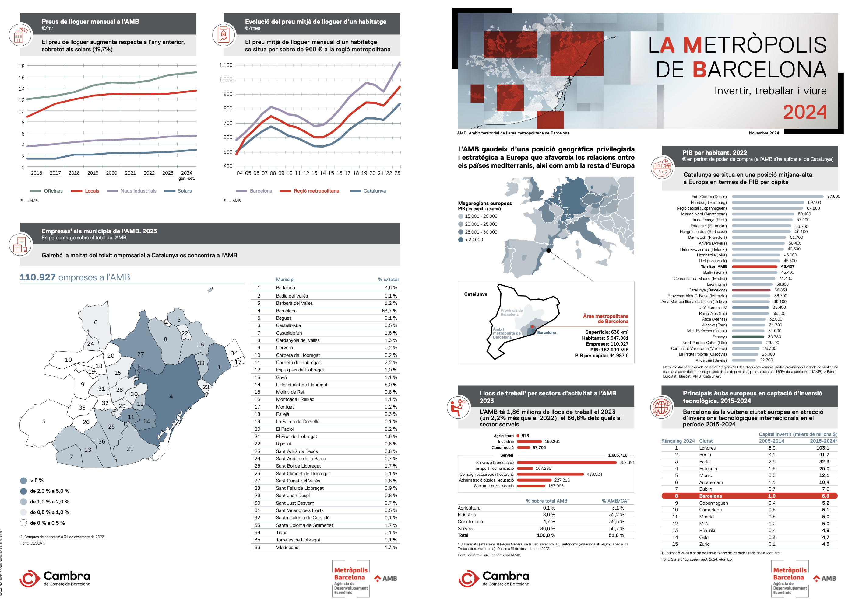 Aquestes són algunes de les dades que destaca l’informe La metròpolis de Barcelona. Invertir, treballar i viure, 2024 de l’Agència de Desenvolupament Econòmic de l’Àrea Metropolitana de Barcelona (AMB), elaborat pel Gabinet d’Estudis de la Cambra de Comerç de Barcelona. L’informe recull més de 80 indicadors, la majoria corresponents a l’any 2023, amb l’objectiu d’aprofundir en el coneixement de l’economia metropolitana, una realitat que va més enllà de la ciutat de Barcelona, i transmetre als inversors nacionals i internacionals les oportunitats d’aquest territori.