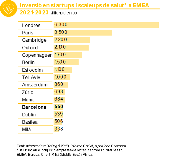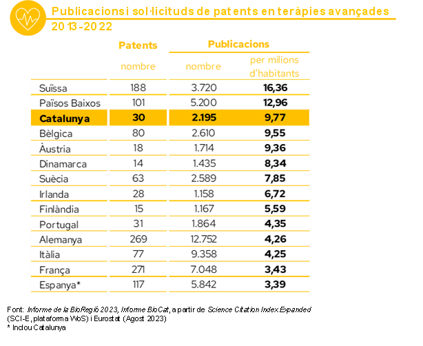 En l’àmbit concret de la salut, Barcelona és l’única ciutat espanyola que es troba en el rànquing EMEA en captació d’inversió global en salut i n’ocupa la dotzena posició (la 9a si ens fixem específicament en el subsector de les tecnologies de la salut). A més, Catalunya se situa en tercera posició, només per sota de Suïssa i els Països Baixos, pel que fa al nombre de publicacions per milió d’habitants sobre teràpies avançades als principals països d’Europa els darrers 10 anys.