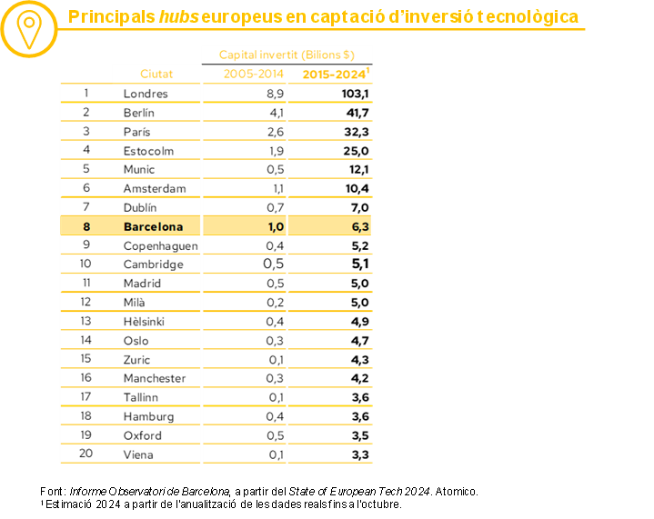 L’àrea metropolitana de Barcelona se situa en vuitena posició en captació d’inversió tecnològica a Europa en el període 2015-2024. En concret, l’ecosistema emprenedor de la ciutat ha rebut 6.300 milions de dòlars procedents d’inversors internacionals en els darrers deu anys, una xifra molt superior a la rebuda en la dècada anterior, 2005-2014 (1.000 milions de dòlars). Això situa Barcelona com la vuitena ciutat europea en atracció d’inversions tecnològiques internacionals en el període 2015-2024, segons l’State of European Tech 2024, d’Atomico. L’interès dels inversors internacionals se centra en factors com el talent emergent, la consolidació del hub d’emprenedoria a l’àrea metropolitana, la competitivitat en preus en comparació amb altres ciutats europees, la col·laboració publicoprivada i les bones comunicacions internacionals.