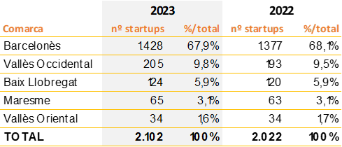 La metròpolis de Barcelona és, també, un nucli d’innovació i emprenedoria. El 2023, el nombre d’empreses emergents al Barcelona&Catalonia Startup Hub, un projecte de la Generalitat de Catalunya que té per objectiu posicionar l’ecosistema de les empreses emergents catalanes a escala mundial, va créixer fins a les 2.102, és a dir 80 més de les que hi havia l’any 2022. El 86,7% d’aquestes empreses emergents es localitzen a l’àrea metropolitana de Barcelona. La comarca on n’hi ha més és el Barcelonès (68%), seguida del Vallès Occidental (9,8%), el Baix Llobregat (5,9%) i el Maresme (3,1%).