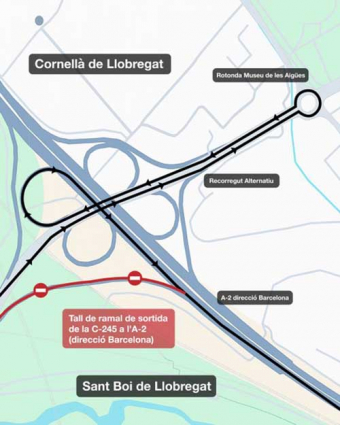 Les obres de l’autovia B-25, a Sant Boi de Llobregat, inicien una nova fase dins del procés de remodelació i a partir del dimecres 3 de setembre, a les 10 hores, quedarà tallat el ramal de sortida des de la C-245 en direcció a l’A-2 en sentit Barcelona. L’alternativa recomanada és seguir per la C-245 direcció Cornellà fins a la rotonda de la carretera d’Esplugues i de l’avinguda del Baix Llobregat (a l’altura del Museu de les Aigües) i fer un canvi de sentit per incorporar-se a l’A-2 en sentit Barcelona per mitjà del bucle (en el mapa s’ha traçat aquest recorregut). Tot plegat, suposarà afectacions de trànsit en aquesta zona de Cornellà per l’augment de vehicles procedents des de Sant Boi. Les obres durant uns dos mesos.