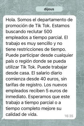 Mitjançant WhatsApp o Telegram, s'estan difonent missatges de suposats empleats d'empreses de renom o agències de màrqueting. Ofereixen guanys fàcils i ràpids a canvi de fer "m'agrada" a publicacions de xarxes socials. Sovint, l'objectiu final és obtenir dades bancàries o que la víctima acabi pagant una quota per "alliberar" els beneficis promesos.