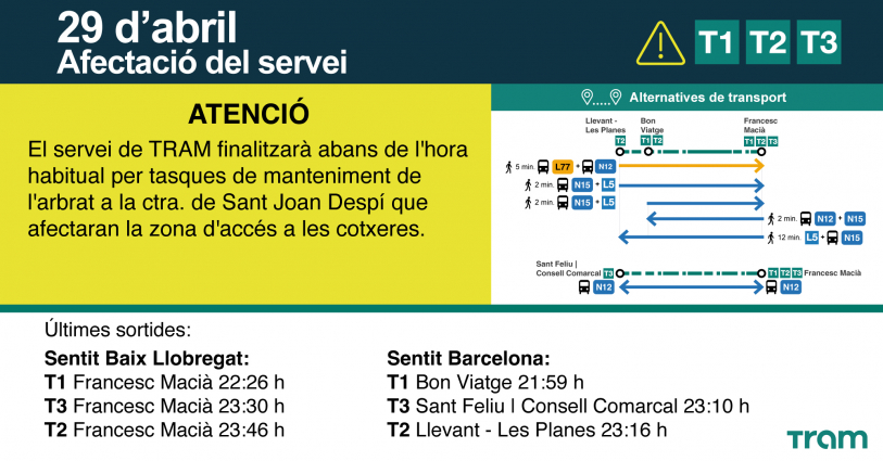 Els usuaris del Trambaix hauran de preveure alternatives de transport per a la nit d'aquest dimecres, 29 d'abril. Segons ha informat l'operadora TRAM, les línies T1, T2 i T3 veuran alterat el seu horari de tancament a causa de tasques de manteniment de l'arbrat a la carretera de Sant Joan Despí.