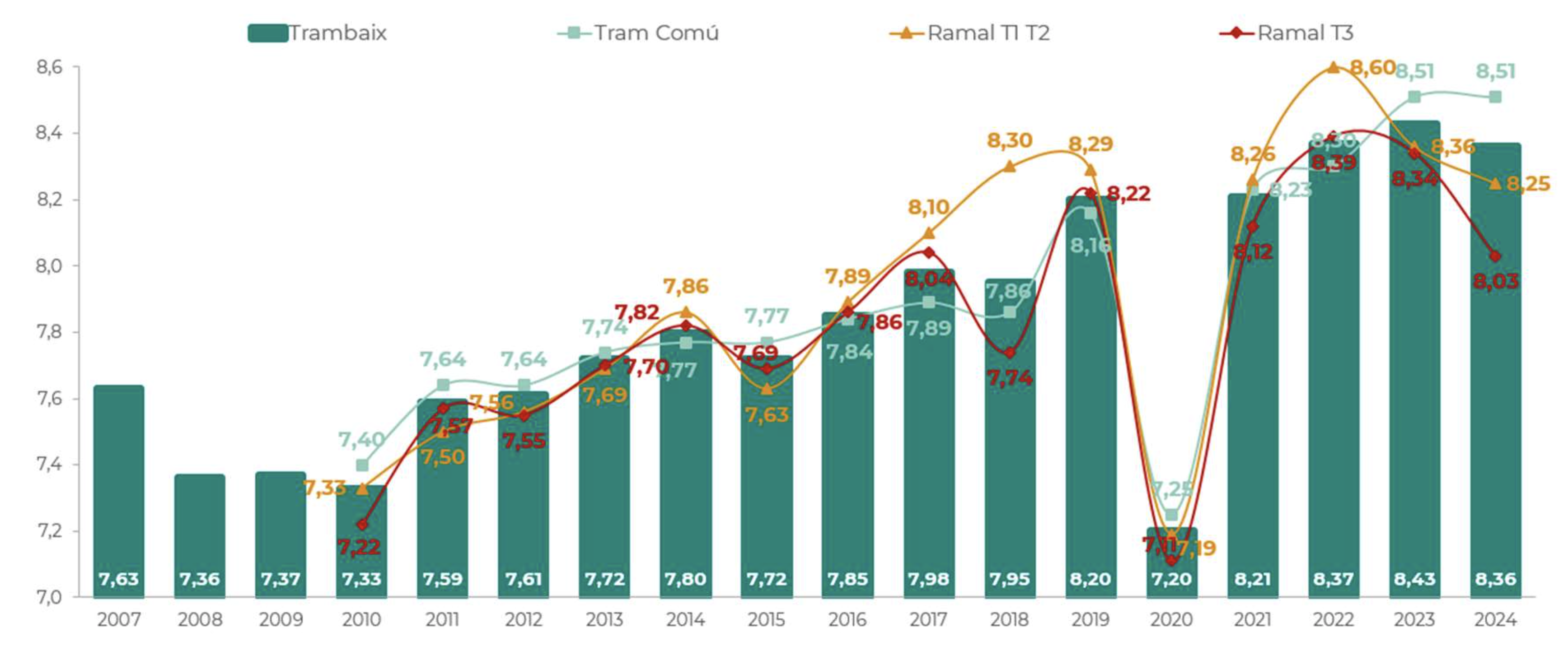 En general, els atributs de Trambaix s'han mantingut respecte a l'any 2023, amb l'augment significatiu de la nota, d'un 7,61 en 2023 al 7,87 en 2024, de la freqüència de pas. A més, el 78,4% de les persones usuàries en Trambaix afirmen tenir altres alternatives de transport per a realitzar els seus desplaçaments, però prefereixen fer-los amb tramvia.
