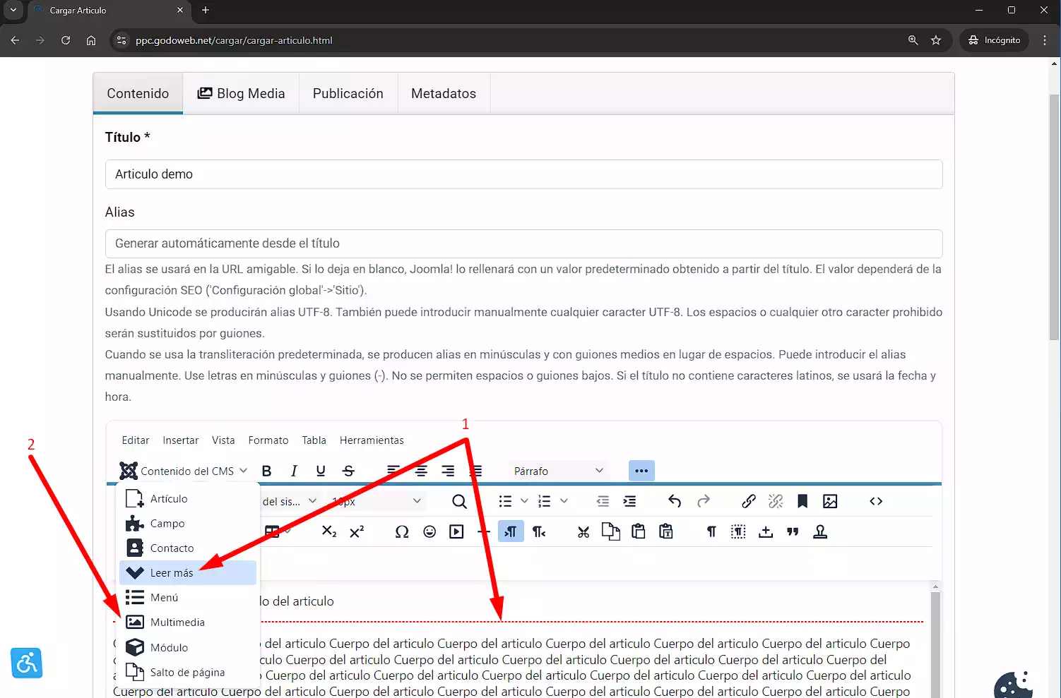 Contenido del CMS. Aquí es donde podremos subir imágenes*(2) y colocarlas en el cuerpo del articulo si fuera necesario y ATENCION donde separaremos la entrada del articulo de cuerpo propiamente dicho seleccionando Leer más*(1)