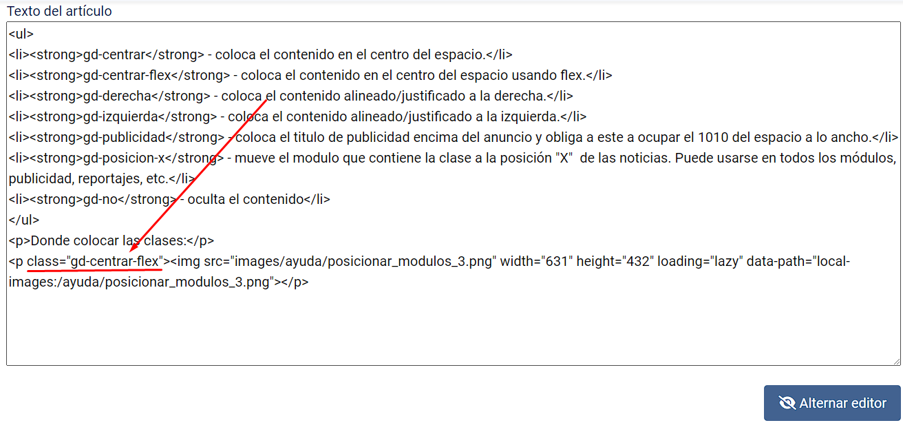 - gd-posicion-x - mueve el modulo que contiene la clase a la posición "X" de las noticias. Puede usarse en todos los módulos, publicidad, reportajes, etc.