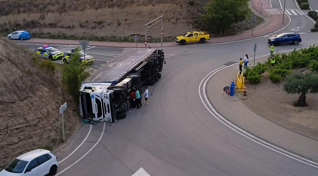 Els Bombers de la Generalitat va activar dues dotacions després que un camió patís un espectacular accident a l’alçada de la rotonda de Can