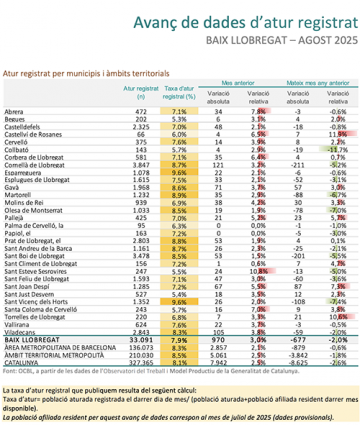 L'Observatori Comarcal del Baix Llobregat ha fet públic l'avanç de les dades d'atur registrat corresponent al mes d’agost de 2025, segons dades de l’Observatori del Treball i Model Productiu de la Generalitat de Catalunya. El passat mes es va tancar amb un total de 970 persones de la nostra comarca que van perdre la seva feina, que representa un augment de la taxa del 3%.