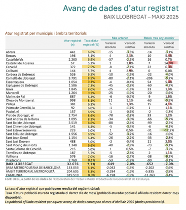 L'Observatori Comarcal del Baix Llobregat ha fet públic l'avanç de les dades d'atur registrat corresponent al mes de maig de 2025, segons dades de l’Observatori del Treball i Model Productiu de la Generalitat de Catalunya. El passat mes es va tancar amb un total de 649 persones de la nostra comarca es van incorporar al mercat laboral, que representa una disminució de la taxa del 2%.