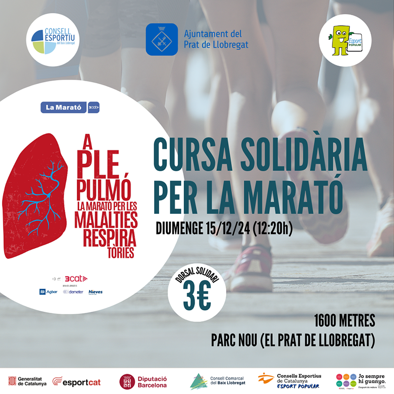 El pròxim diumenge 15 de desembre de 2024 a les 12.20h i coincidint amb el tercer Cros Comarcal Escolar tindrà lloc al Parc Nou del Prat de Llobregat la “Cursa Solidària per la Marató”. Una iniciativa promoguda per al Consell Comarcal del Baix Llobregat.