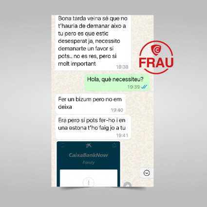 Aquesta modalitat es basa en la confiança. L'usuari rep un missatge d'un número legítim que té guardat a l'agenda o amb qui comparteix grup. El contacte demana un Bizum immediat amb qualsevol excusa. Tanmateix, no és el conegut qui escriu, sinó un ciberdelinqüent que ha robat el compte original.