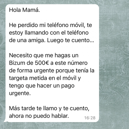 L'estafador contacta amb pares o mares des d'un número desconegut fent-se passar pel seu fill. L'argument sempre és el mateix: el telèfon se li ha trencat o l'ha perdut i necessita diners urgentment per a una gestió immediata. L'objectiu és que el pare o la mare, fruit del neguit, actuïn sense pensar.