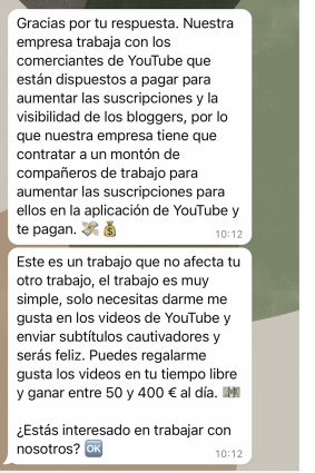 Mitjançant WhatsApp o Telegram, s'estan difonent missatges de suposats empleats d'empreses de renom o agències de màrqueting. Ofereixen guanys fàcils i ràpids a canvi de fer "m'agrada" a publicacions de xarxes socials. Sovint, l'objectiu final és obtenir dades bancàries o que la víctima acabi pagant una quota per "alliberar" els beneficis promesos.