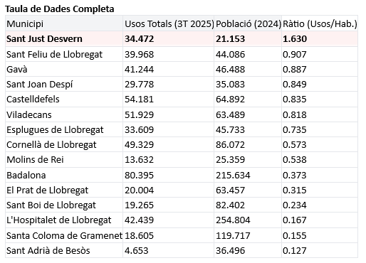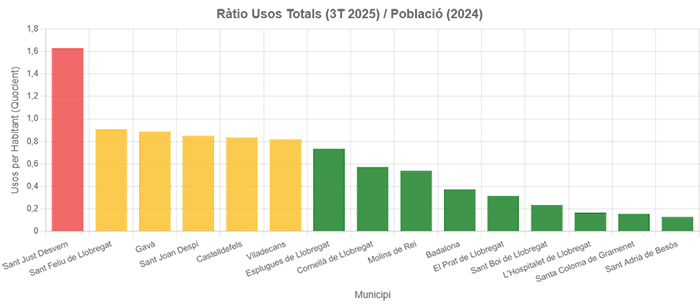 D’altra banda, Sant Just Desvern continua encapçalant l’ús de la bicicleta en relació amb el nombre d’habitants, situant-se molt per sobre del segon municipi segons la ràtio d’usos per habitant. Aquesta diferència és especialment significativa respecte al segon municipi del rànquing, fet que consolida Sant Just com un referent en mobilitat ciclista a escala metropolitana. Aquest ús intensiu no és fruit només de polítiques públiques o infraestructures, sinó sobretot de la implicació de la ciutadania.
