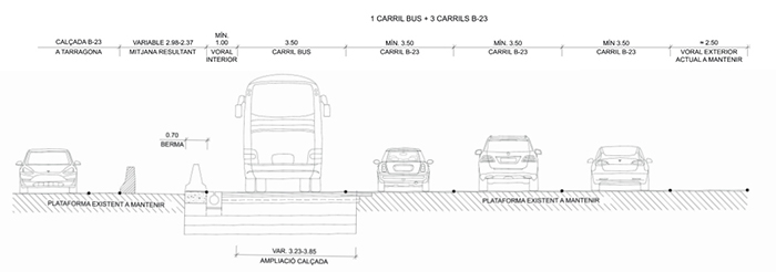 L’obra consisteix en la formació d’un carril exclusiu per a l’autobús en sentit Barcelona aprofitant part de l’espai de la mitjana de la B-23. El nou carril té 3,5 m d’amplada i se situa a l’esquerra dels carrils de circulació sentit Barcelona, amb els quals estarà separat mitjançant senyalització horitzontal. El nombre de carrils de circulació -dos o tres, segons el tram- i la seva amplada es mantenen. Els autobusos hi podran accedir en qualsevol punt al llarg del recorregut.